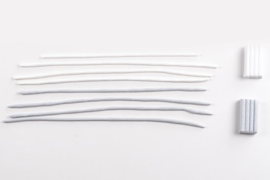 1. Készítsünk mindkét színű gyurmából 12-12 db kb. 3 mm vastag rudat.